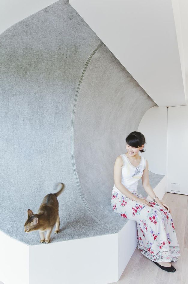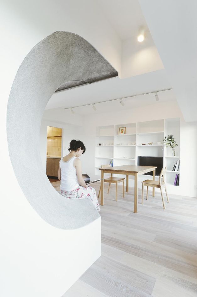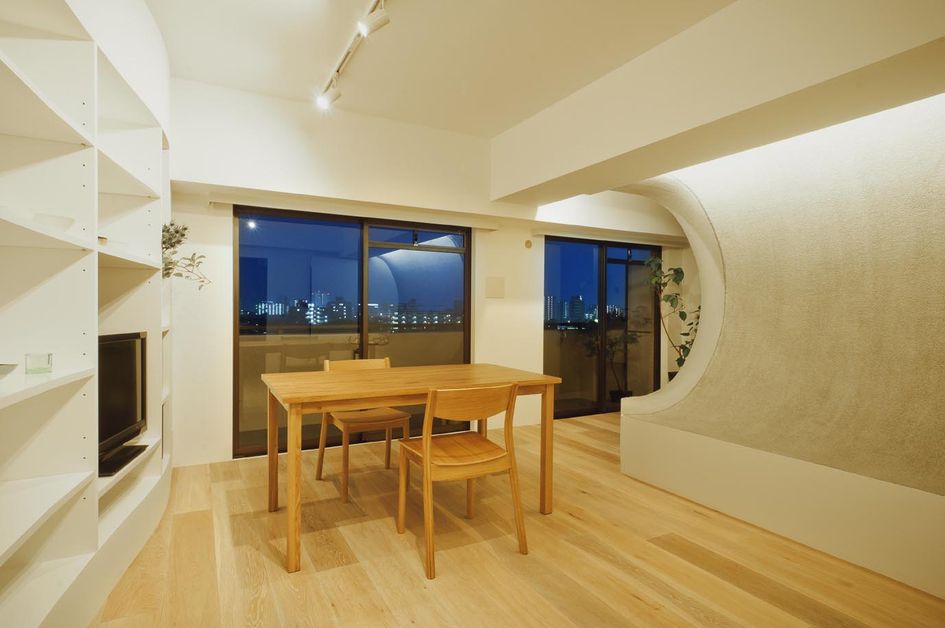 また、へこんだ壁はリビングからは、同時に5人は座ることができるベンチになり、和室側からはくぼみの上を収納、下がフローリングを利用した床の間となっている。凹部はクッション性のあるカーペットを張っている。夜にはR壁上部に設けた間接照明がやわらかい光でリビングを包み込む。