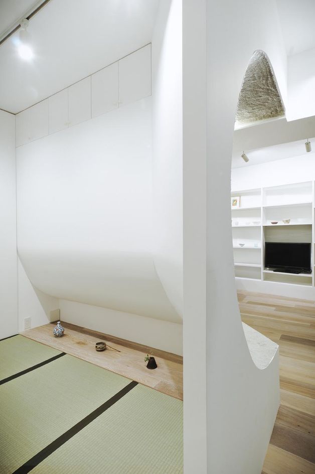 限定された空間の中でリビング空間の広がを感じながら、同時に2つの機能(リビング:人が集う空間、和室:寝室)を実現するため、断面的に壁をR状に曲げてテラスに対し開く様に伸ばすことで外への開放感を獲得した。