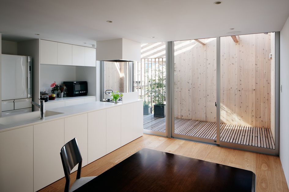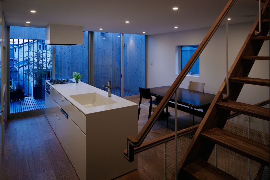 そのためにまずは二階のダイニングから続くスノコテラス、屋上にはルーフバルコニーといった屋外空間を用意し、外部への広がりをつくると同時に建物全体をルーバーとスノコですっぽりと覆ってしまうことを考えた。ルーバーによって拡散された柔らかい光が二階へ、更にスノコを介して淡い光が一階へと落ちてゆく。