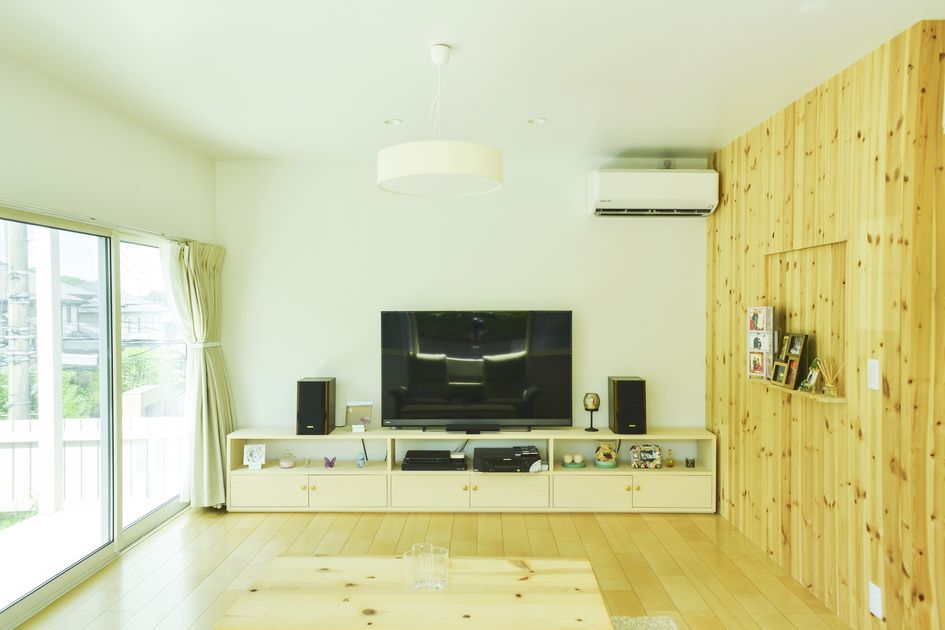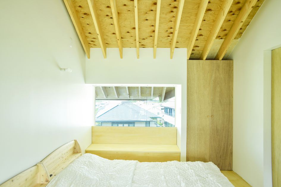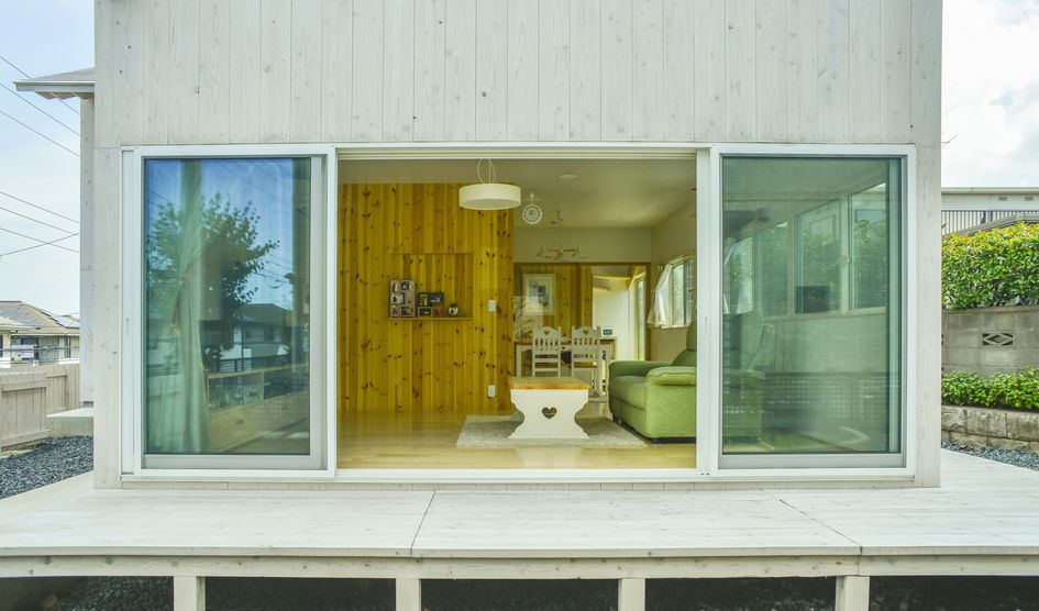 内部は、1階では白い抽象的な空間にし奥様の選ばれた家具や小物が空間を彩る。また、水平窓を多く設置し、庭の緑をインテリアとして取り込むだけでなく縁側を歩く人を映し出す。2階は外部と連続するように垂木を現しにし、山小屋のようなナチュラルな空間を 作り出している。