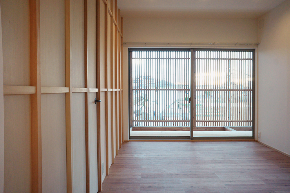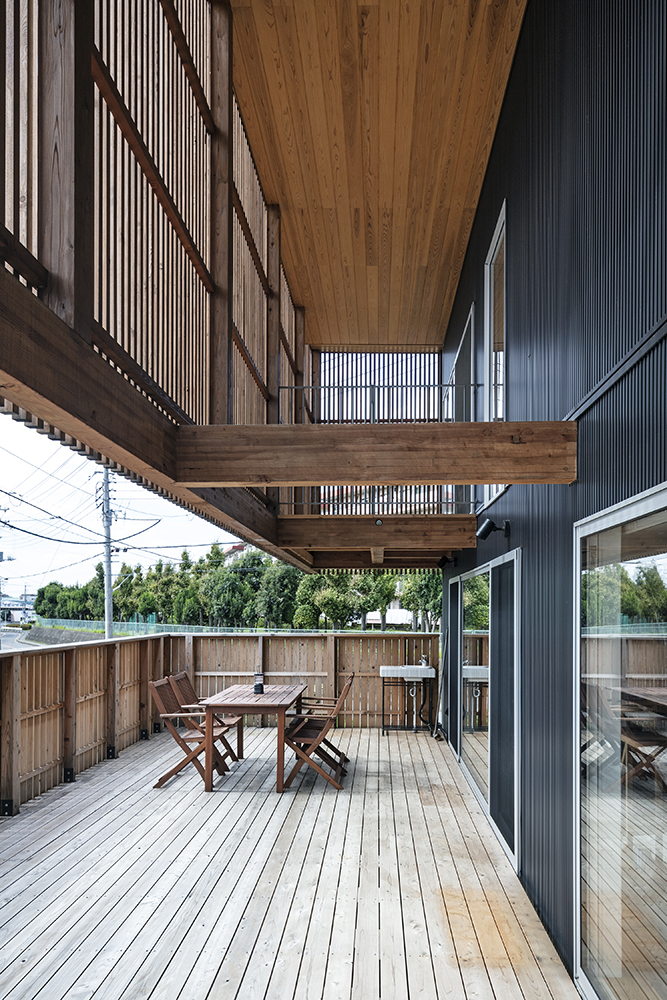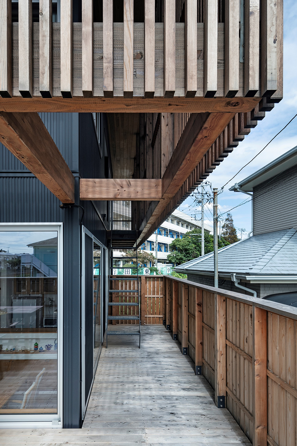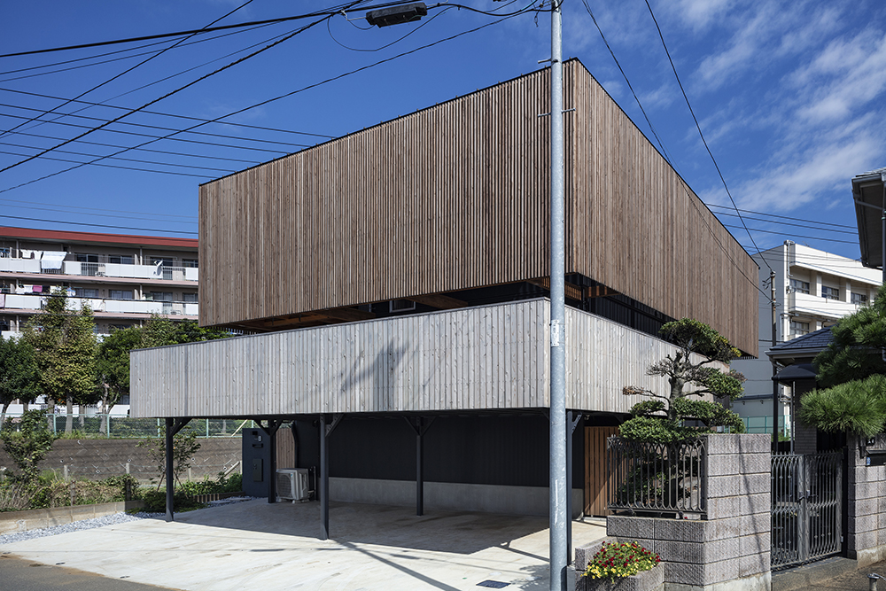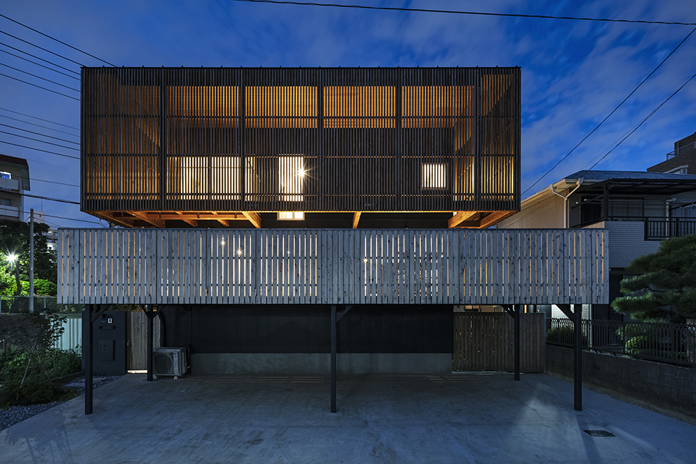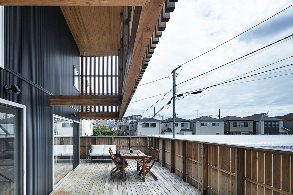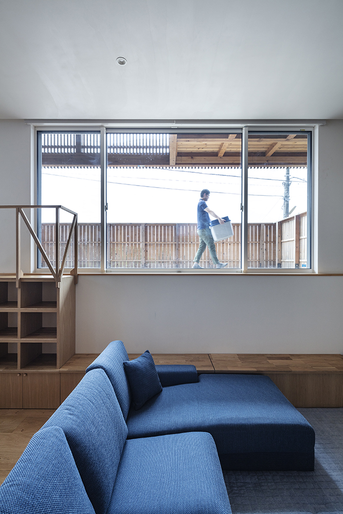 はじめに木のルーバーを2階の四周に回し木に包まれた環境を作り、目線を隠し周囲からの緩衝空間を作りつつ暖かみのある空間をつくろうとした。そして1階の階高を高くし、2階との間の1.5階の位置に家族のための地面というべきテラスを設けた。室内から見ると、目線の位置にテラスの床がくるため、目の前を子どもが遊んだり、家族が寛ぐシーンが展開する。また、木ルーバーが1.5階テラスの天蓋の役割となりテラスに落ち着きをもたらすと同時に、柱がないため木の輪が浮かんでいるような感覚をもたらしている。