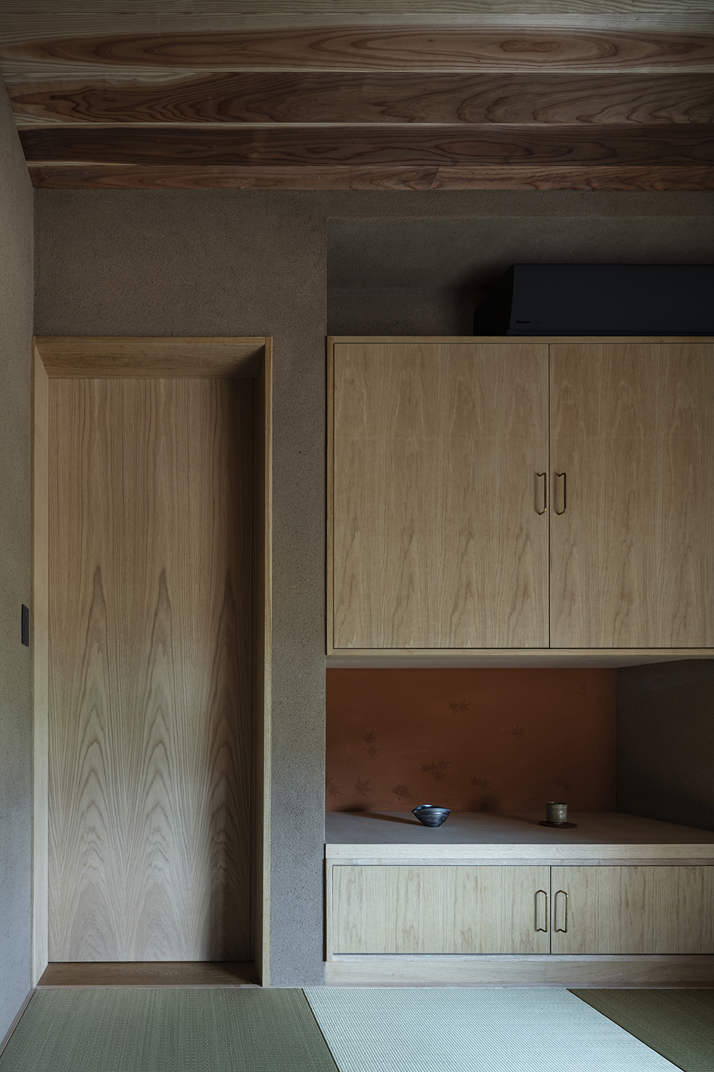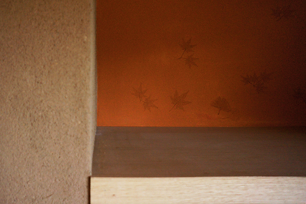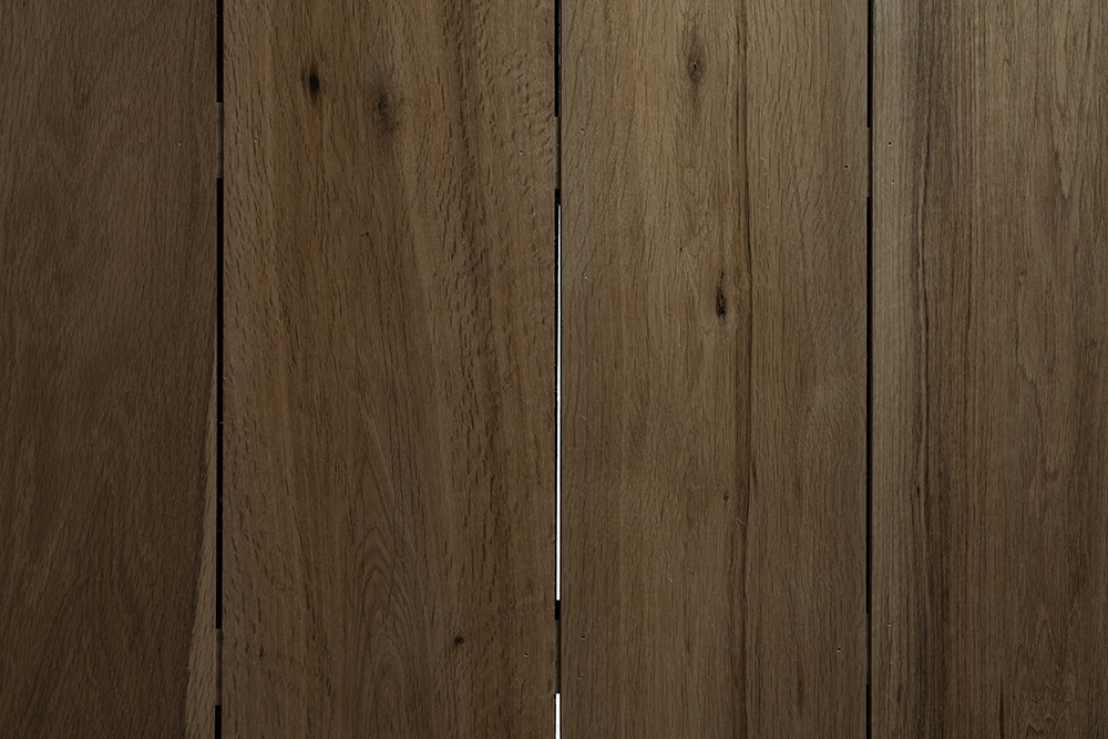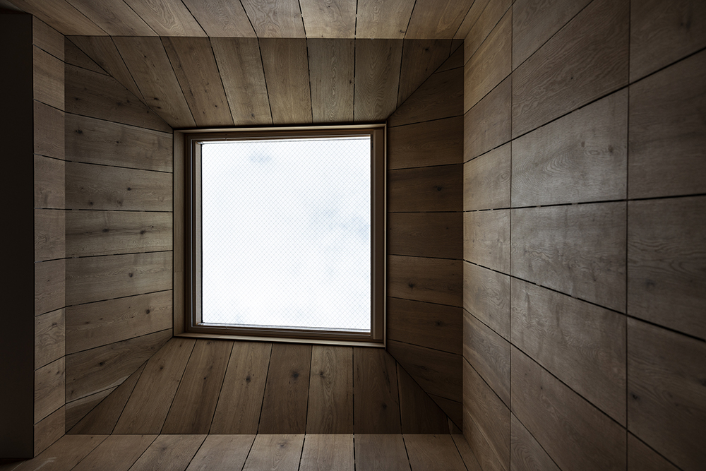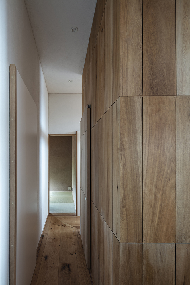 家の、輪の中心でもある階段室と廊下の間仕切りには楢の挽き板を隙間を開けて貼った。外から部屋、部屋から廊下を通りそしてオークの壁を抜け階段室のトップライトへと自然と風が抜け、機能上も輪の構成を生かすよう計画している。