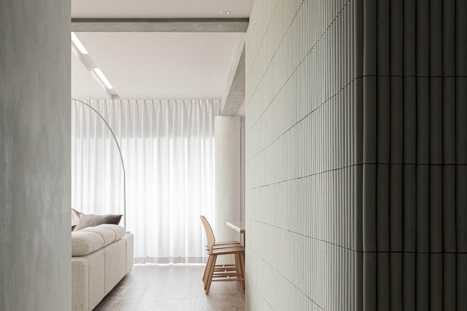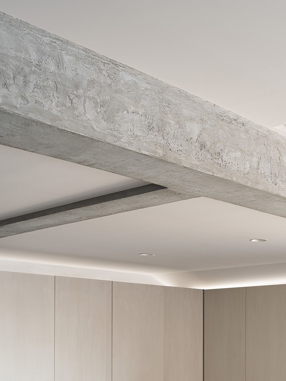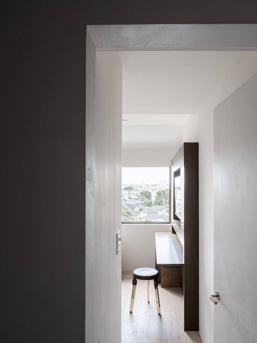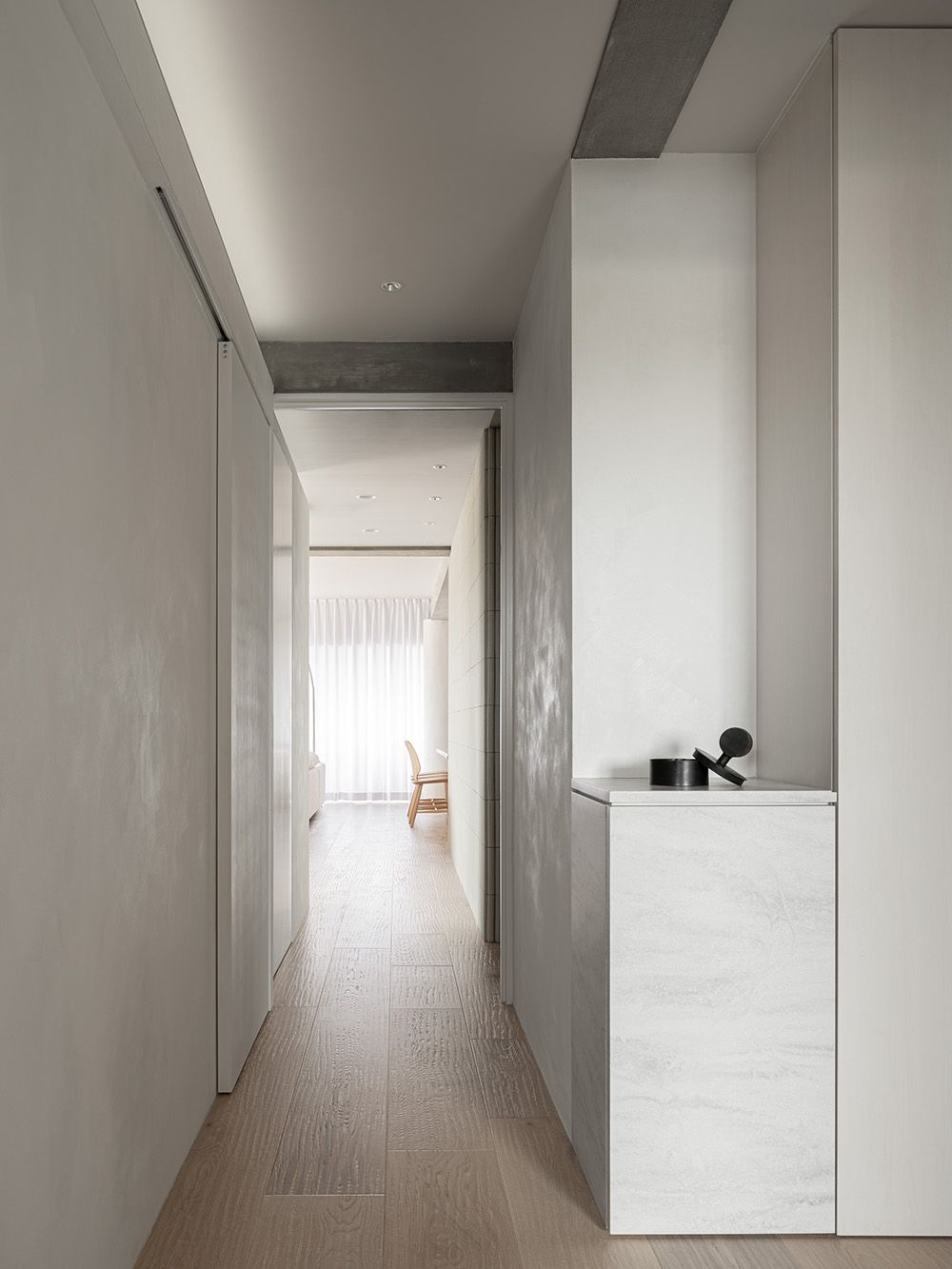 しかし壁のコンクリートに穴をあけることはできないため、使用する建材はすべて『白』を基調とすることとした。壁の左官や塗装はもちろん、フローリングやタイルに薄く白塗装、既存の梁にも白を混ぜたモルタルを重ね塗りし、自然光が部屋の隅々までいきわたるよう配慮している。また素材自体も左官やなぐり加工フローリングなど自然素材を用いつつ様々な素材を使い一見『白』に見える空間に変化や特徴を出している。また、玄関からリビングまで天井と壁の間に間接照明のスリットを設けたり、壁に大きめのニッチを設けたり等、小さなディテールの積み重ねもおこなっている。