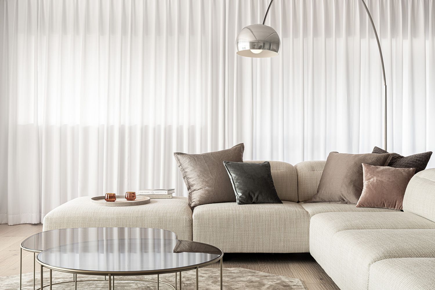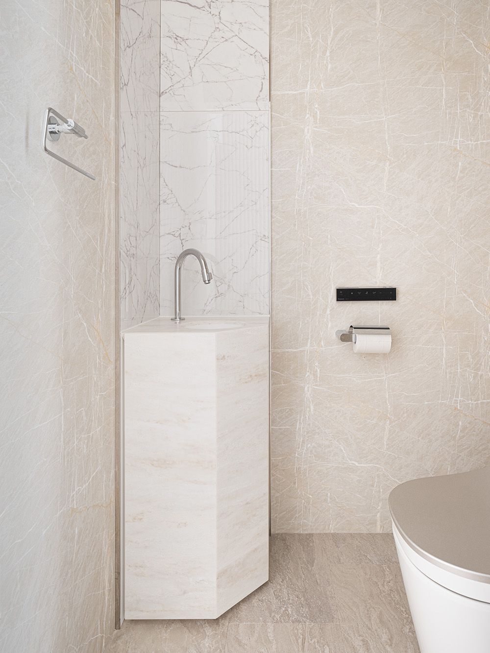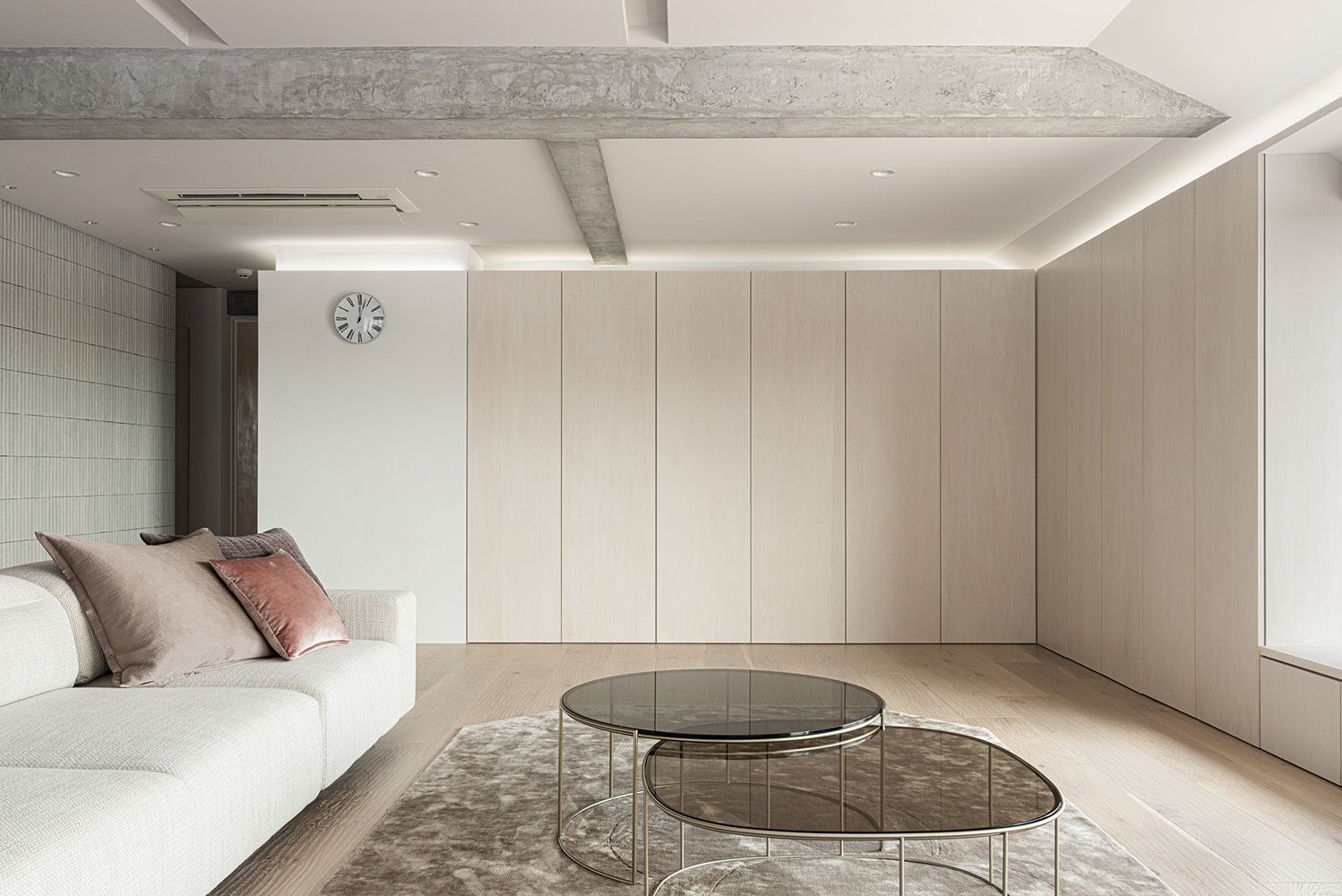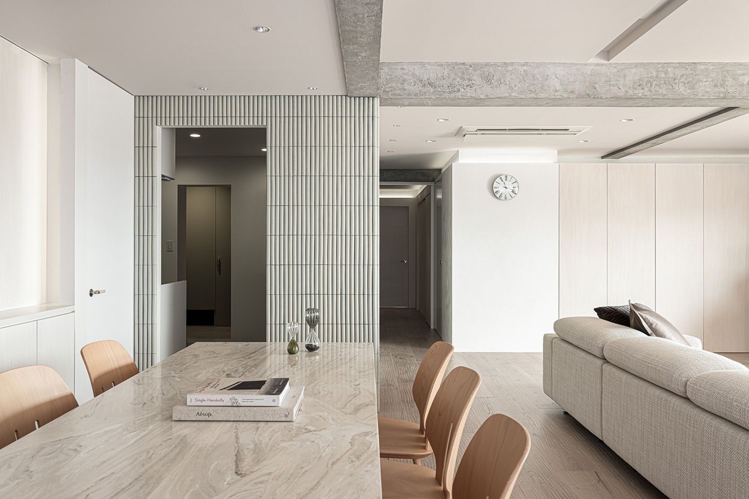 しかし壁のコンクリートに穴をあけることはできないため、使用する建材はすべて『白』を基調とすることとした。壁の左官や塗装はもちろん、フローリングやタイルに薄く白塗装、既存の梁にも白を混ぜたモルタルを重ね塗りし、自然光が部屋の隅々までいきわたるよう配慮している。また素材自体も左官やなぐり加工フローリングなど自然素材を用いつつ様々な素材を使い一見『白』に見える空間に変化や特徴を出している。また、玄関からリビングまで天井と壁の間に間接照明のスリットを設けたり、壁に大きめのニッチを設けたり等、小さなディテールの積み重ねもおこなっている。